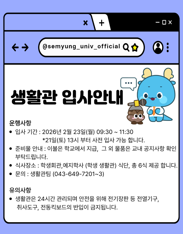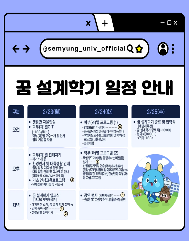 본문 시작 홈으로 커뮤니티 학과소개 교수소개 교육과정 학과 행사 및 활동 커뮤니티 홈페이지가이드 열린정보 학과일정 학과공지 채용정보 및 자료 열린정보 포토갤러리 먹거리, 즐길거리 포토갤러리 사진 사진 영상 사진 페이스북 트위터 프린트 사진 영상 2026학년도 신입생 '꿈 설계학기(오리엔테이션)' 시행 건축학과 377 2026-02-13 https://www.semyung.ac.kr/prog/vwBoard/bbs01/kor/sub08_02_01/view.do?board_num=188873&mno=sub08_02_01&pageIndex=1&searchCondition=&searchKeyword= 목록 이전2026학년도 정시모집 및 편입학 최초합격자 발표 다음 새해 복 많이 받으세요. 만족도조사 만족도 조사 이 페이지에서 제공하는 정보에 대하여 만족하시나요? 매우만족 만족 보통 불만족 매우불만족