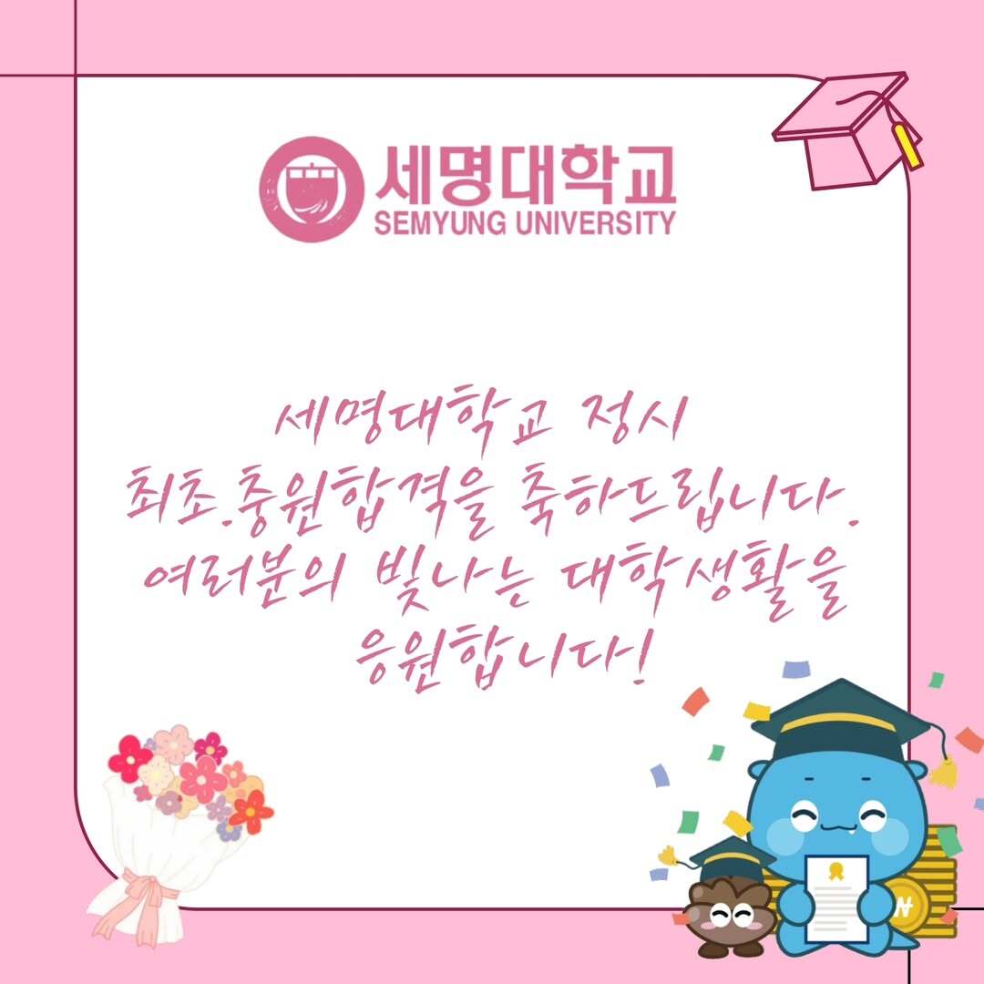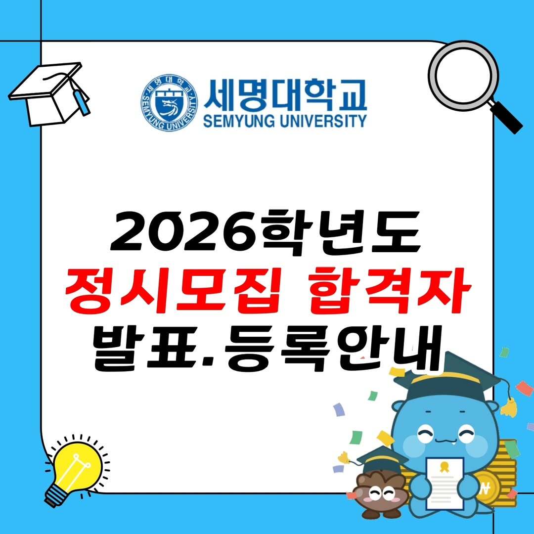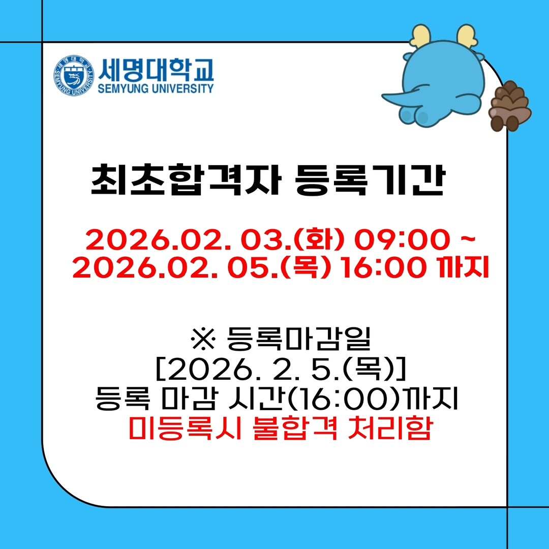 본문 시작 홈으로 커뮤니티 학부소개 교수소개 학부과정 커뮤니티 입학안내 홈페이지가이드 학부 공지사항 학부 공지사항 자료실 FAQ 인스타그램 ➜ 학부 공지사항 페이스북 트위터 프린트 2026학년도 정시모집 합격자 발표 등록 안내 자율전공학부 조회 : 696 등록일 : 2026-02-05 목록 이전세명대학교 자율전공학부 생활 소개 다음 선배가 알려주는 기숙사 체크리스트 만족도조사 만족도 조사 이 페이지에서 제공하는 정보에 대하여 만족하시나요? 매우만족 만족 보통 불만족 매우불만족