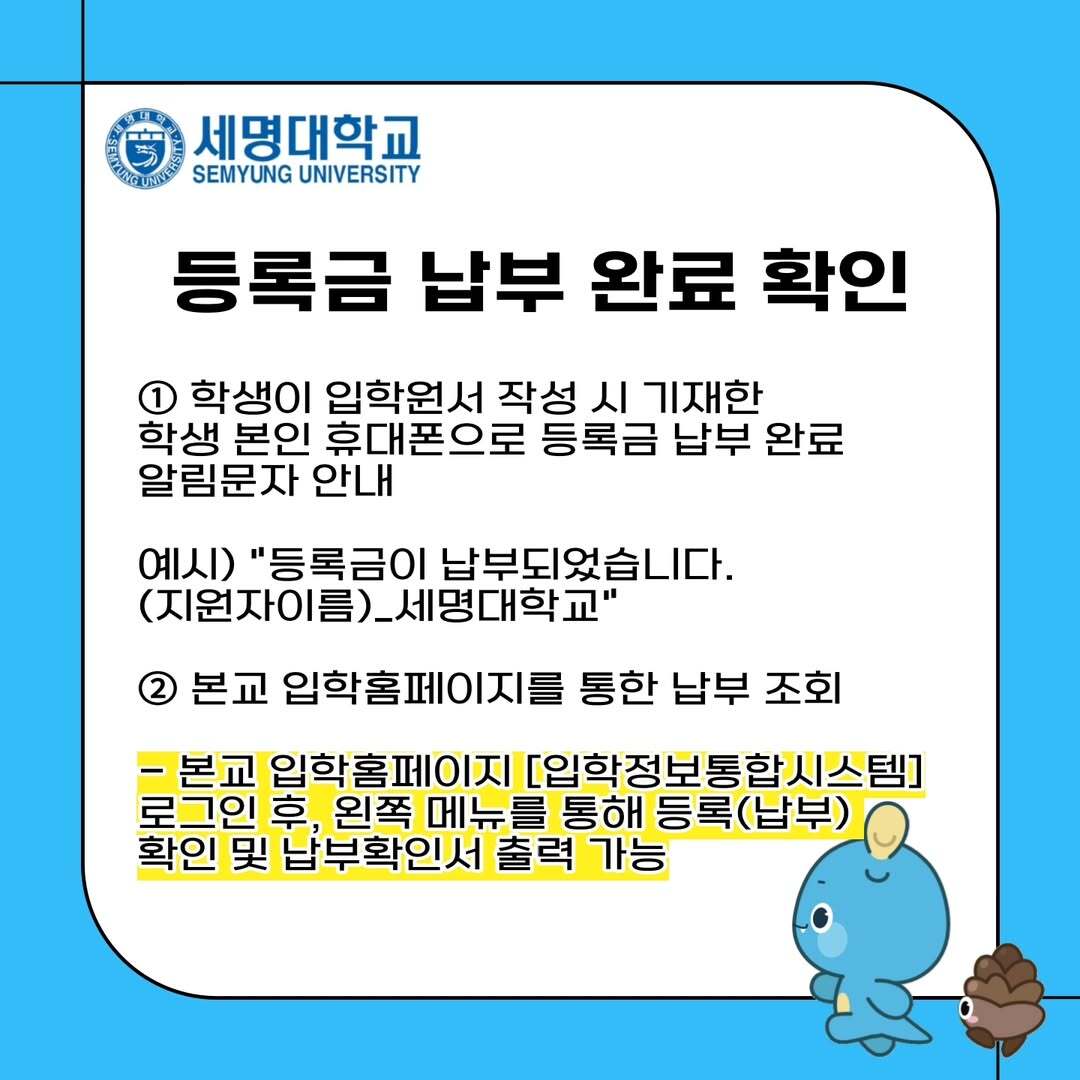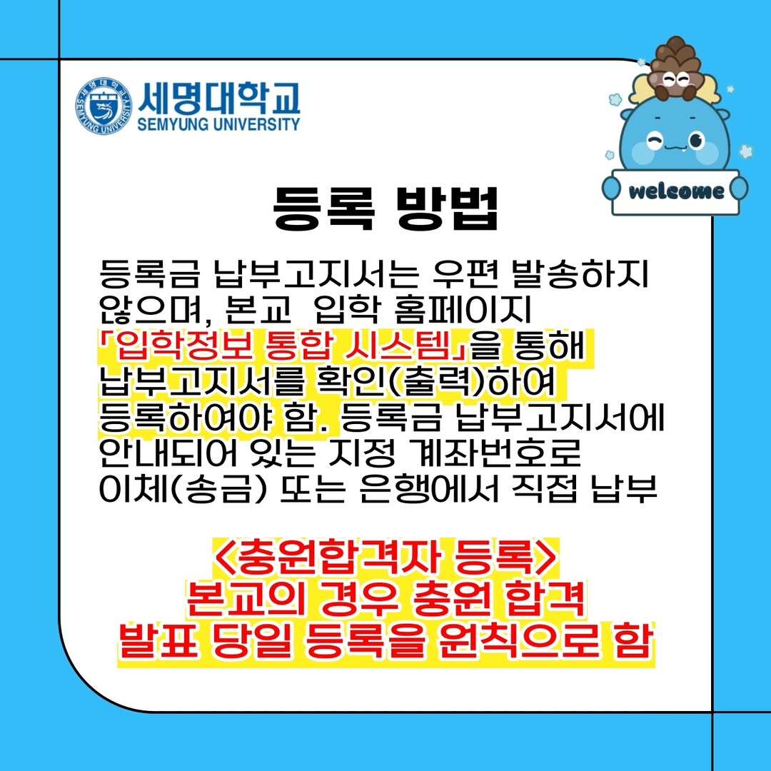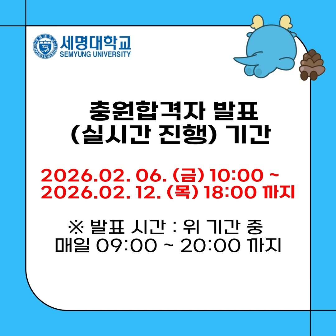 본문 시작 홈으로 커뮤니티 학부소개 교수소개 학부과정 커뮤니티 입학안내 홈페이지가이드 학부 공지사항 학부 공지사항 자료실 FAQ 인스타그램 ➜ 학부 공지사항 페이스북 트위터 프린트 2026학년도 정시모집 합격자 발표 등록 안내 자율전공학부 조회 : 696 등록일 : 2026-02-05 목록 이전세명대학교 자율전공학부 생활 소개 다음 선배가 알려주는 기숙사 체크리스트 만족도조사 만족도 조사 이 페이지에서 제공하는 정보에 대하여 만족하시나요? 매우만족 만족 보통 불만족 매우불만족