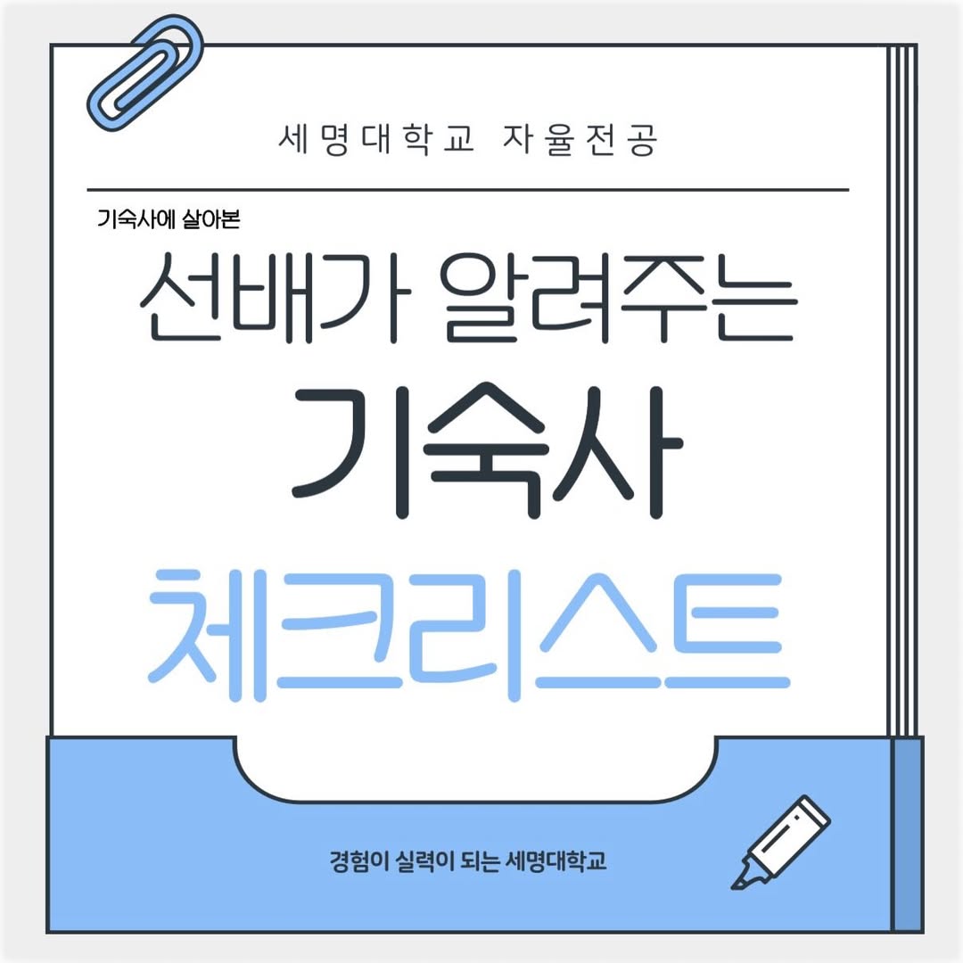 본문 시작 홈으로 커뮤니티 학부소개 교수소개 학부과정 커뮤니티 입학안내 홈페이지가이드 학부 공지사항 학부 공지사항 자료실 FAQ 인스타그램 ➜ 학부 공지사항 페이스북 트위터 프린트 선배가 알려주는 기숙사 체크리스트 자율전공학부 조회 : 1163 등록일 : 2026-02-06 목록 이전2026학년도 정시모집 합격자 발표 등록 안내 다음 세명대학교 대학 시설 안내 만족도조사 만족도 조사 이 페이지에서 제공하는 정보에 대하여 만족하시나요? 매우만족 만족 보통 불만족 매우불만족