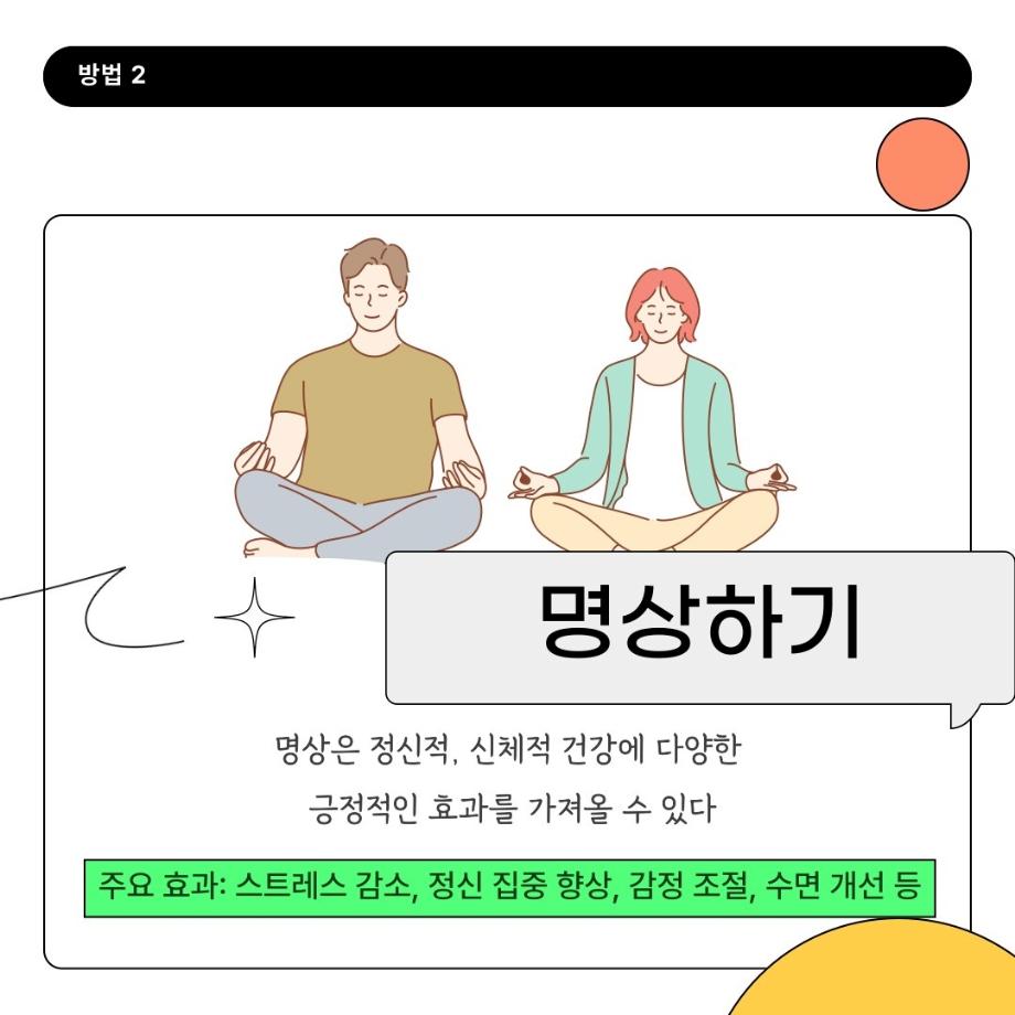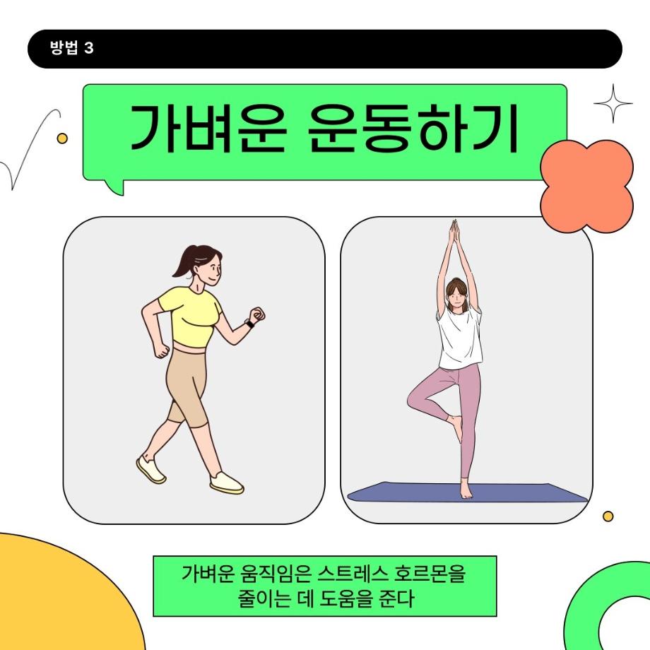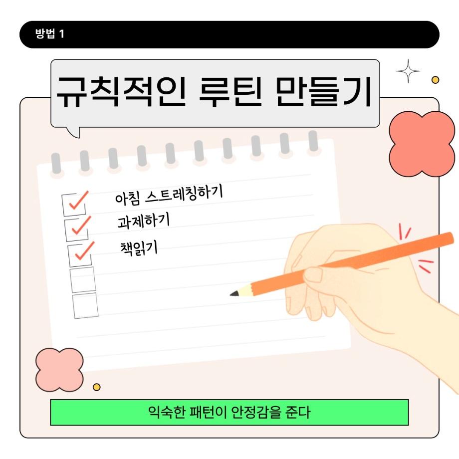 본문 시작 홈으로 학과 커뮤니티 학부소개 교수소개 교육목표 입학안내 학과 커뮤니티 대학원 커뮤니티 홈페이지가이드 학과 갤러리 학과소식 학사일정 학과 갤러리 학과 갤러리 페이스북 트위터 프린트 스트레스를 줄이는 5가지 방법 상담심리학과 1657 2025-02-12 1. 규칙적인 루틴 만들기 2. 명상하기 3. 가벼운 운동하기 4. 감정 기록하기 5. 취미 활동 하기 스트레스는 이렇게 간단한 방법으로도 줄일 수 있습니다. 이 방법 외에도 여러분에게 맞는 방법을 찾아 스트레스를 조절해 보세요! 목록 이전2월 학사일정 다음 2025 신입생 꿈설계학기 만족도조사 만족도 조사 이 페이지에서 제공하는 정보에 대하여 만족하시나요? 매우만족 만족 보통 불만족 매우불만족